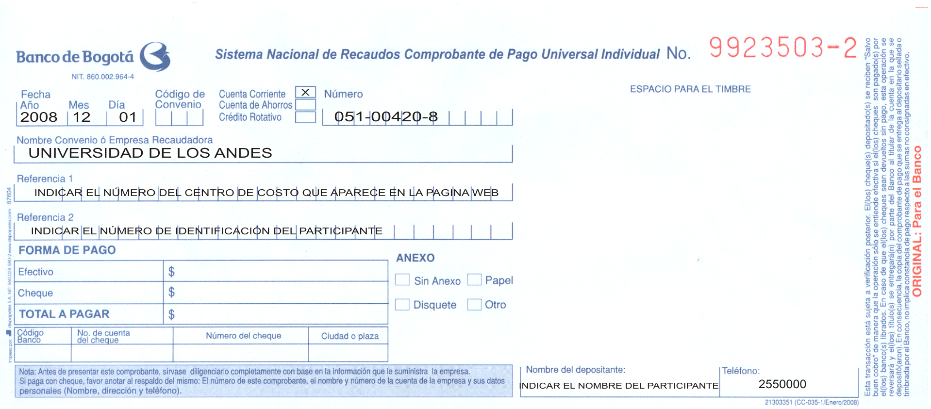 inscripcion ($170.000 o $85.000, si se tiene media beca de inscripción) en el Banco de Bogotá, al numero de cuenta corriente 051-00420-8, indicando nombre, identificación y el centro de costo 3469 (ver ejemplo adjunto). Favor conservar recibo de consignacion y entregarlo el lunes 6 de julio, día de registro, en Villa de Leyva.